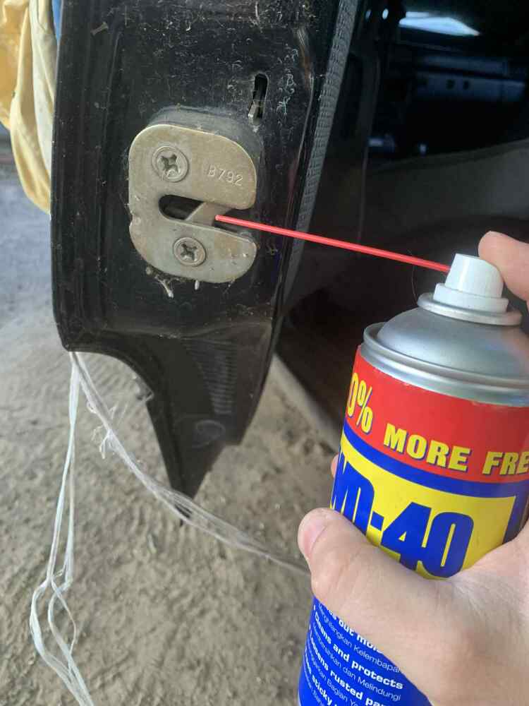A zár nyílásába és a zárnyelvre fújtam egy kis WD-40-et, majd párszor kinyitottam és becsuktam az ajtót. Azonnal simán kezdett mozogni, a zár szépen „kattan”, és tökéletesen zár az ajtó.