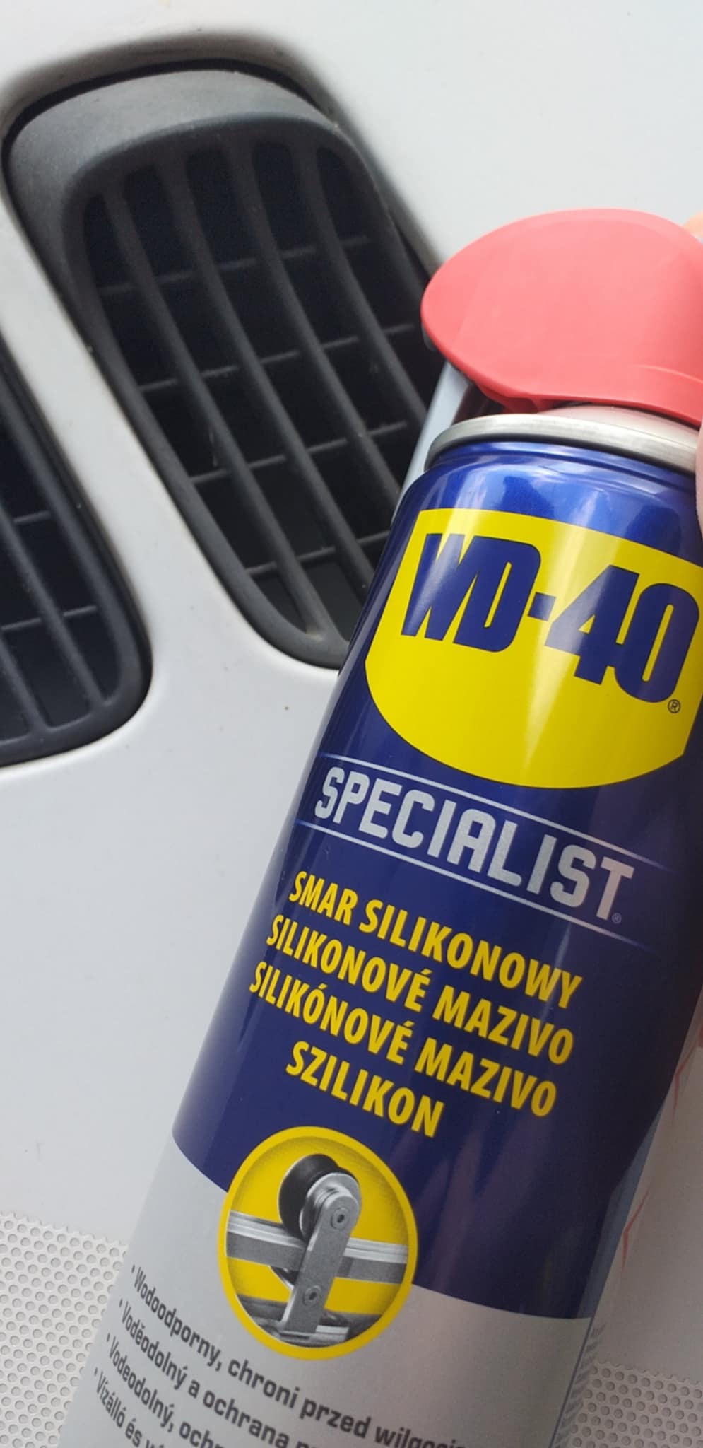Autó légbeömlő rács befújása wd40-nel.
