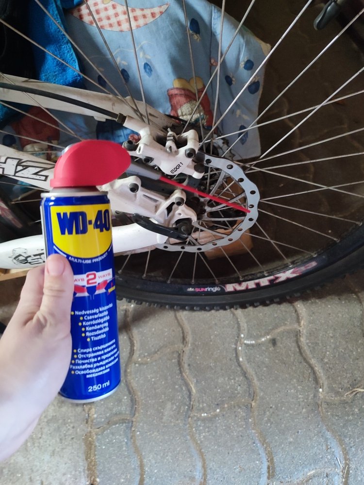 Befújtam WD-40-nel, majd áttöröltem – a lánc simán mozgott és csendes lett.