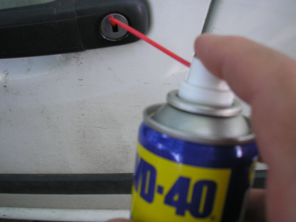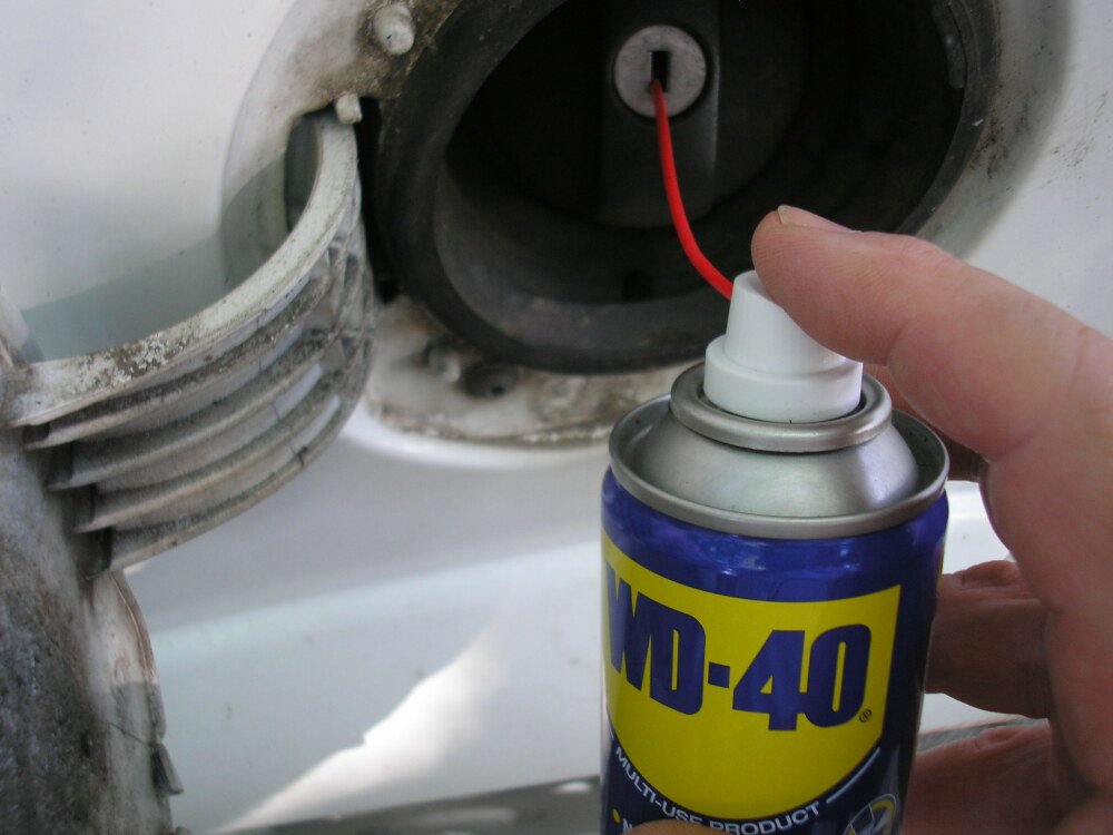 A kopott zárakban a szintén kopott kulcsok nehezen nyitják az ajtókat. Vegyük elő a WD-40 multifunkciós folyadékunkat és fújjuk be a résen keresztül. Ne feledkezzünk meg a tanksapka zárjáról sem!