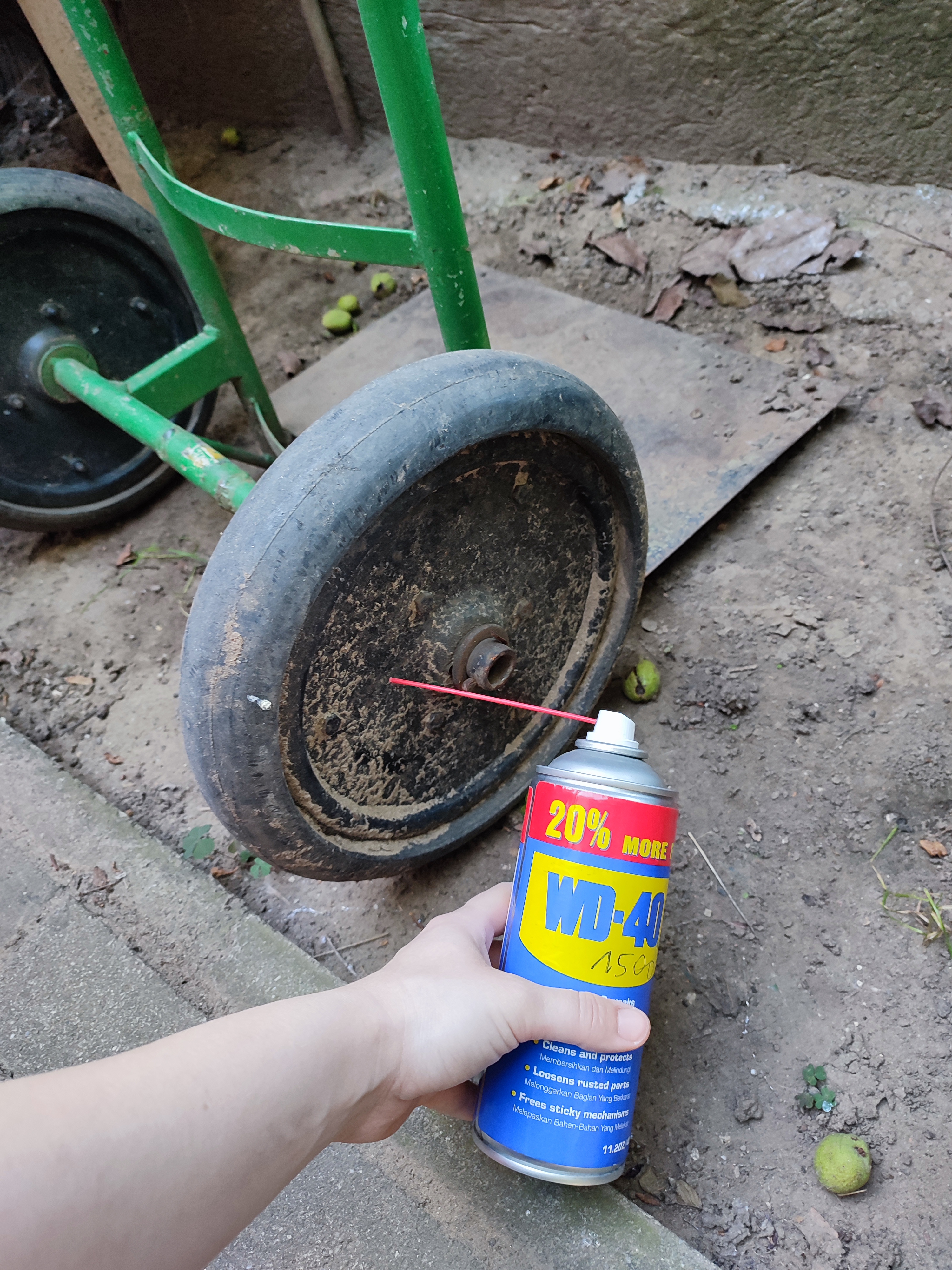 A kuka kivivő kiskocsi kereteit cseréltük volna, de a csavarok teljesen beragadtak. WD-40-nel fellazítottuk, és simán ment a csere!