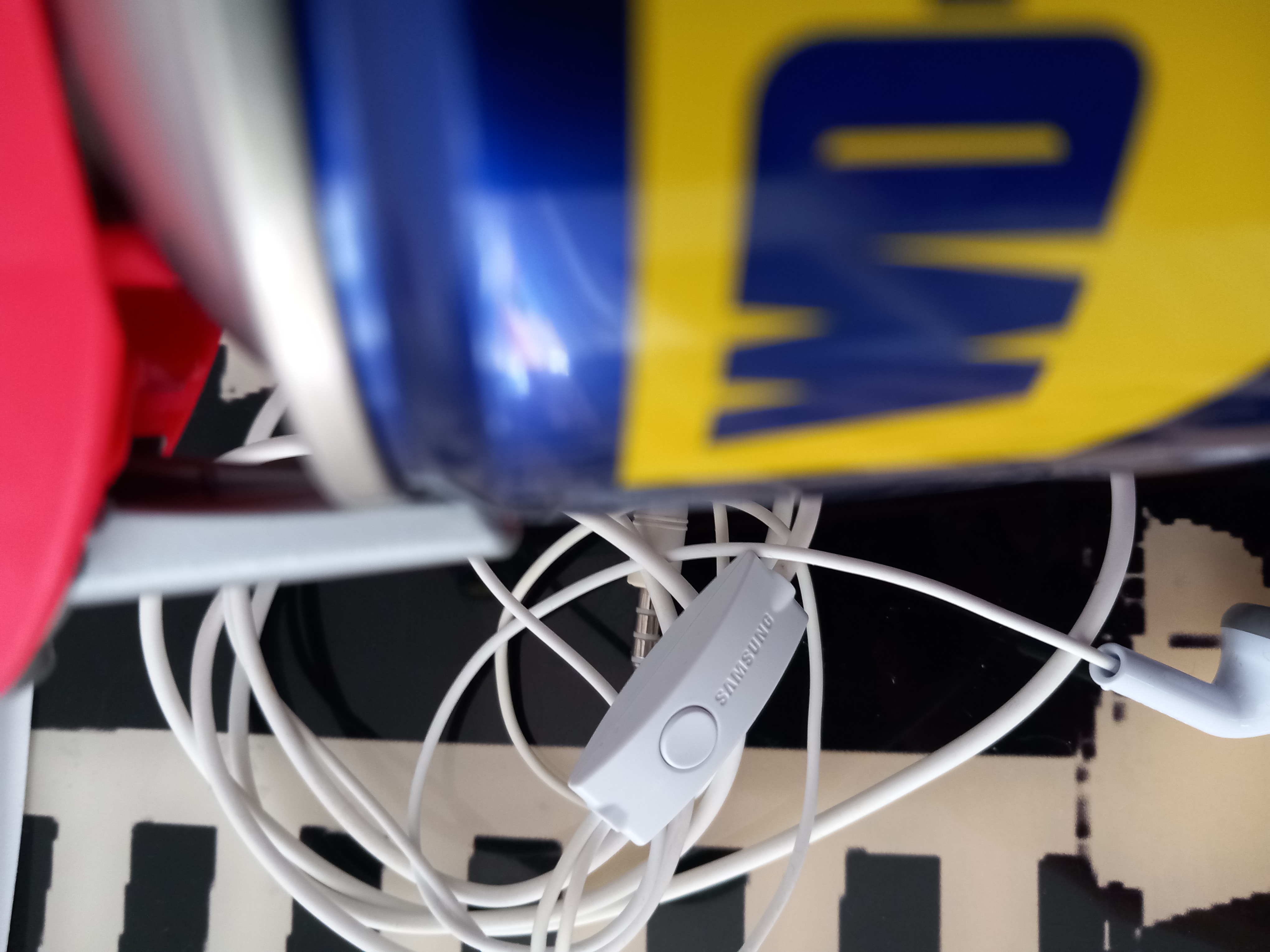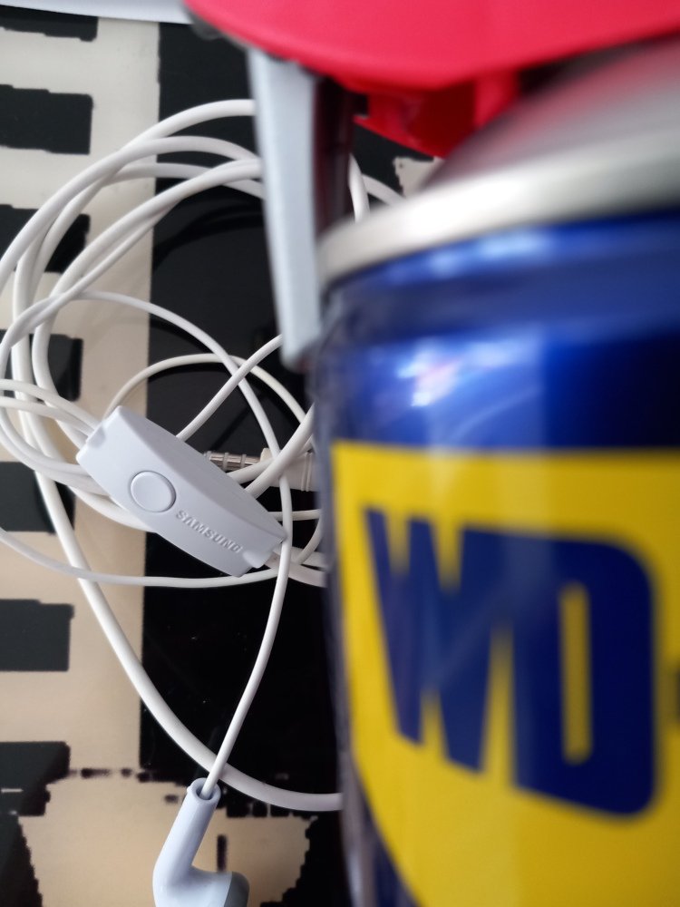 Mobil fülhallgató nyomógomjának befújása wd40-nel a benyomódás ellen.