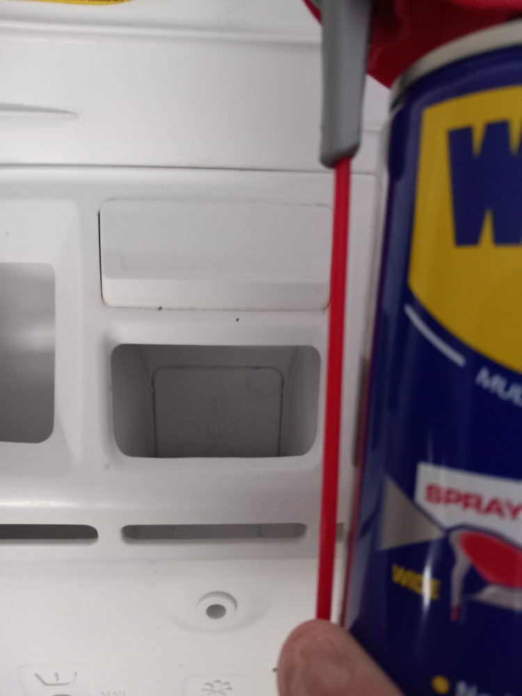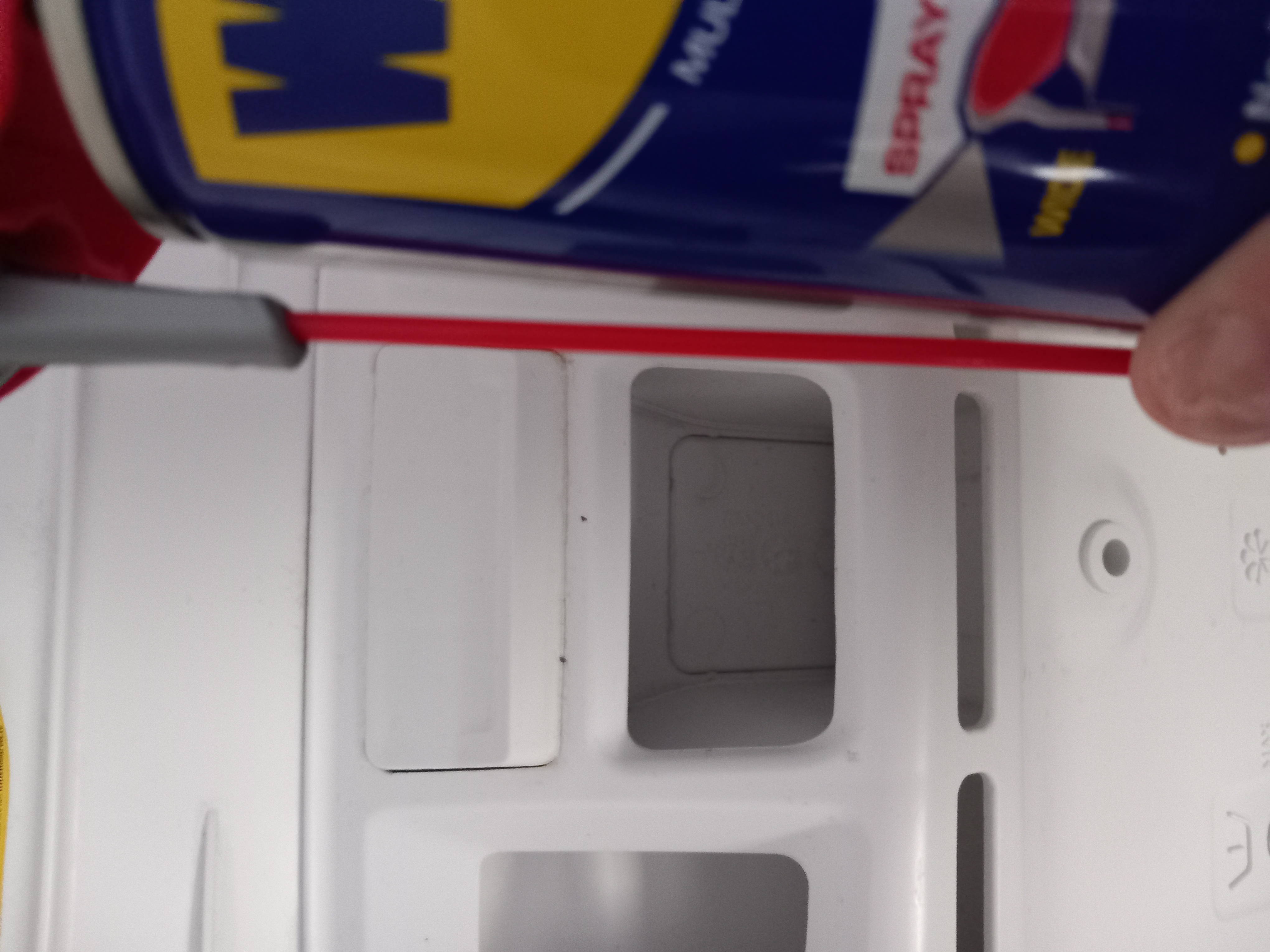 Benyomódott mosógép tartály befújása wd40-nel. Kezelést követve könnyen le lehetet venni és eltakarítani.