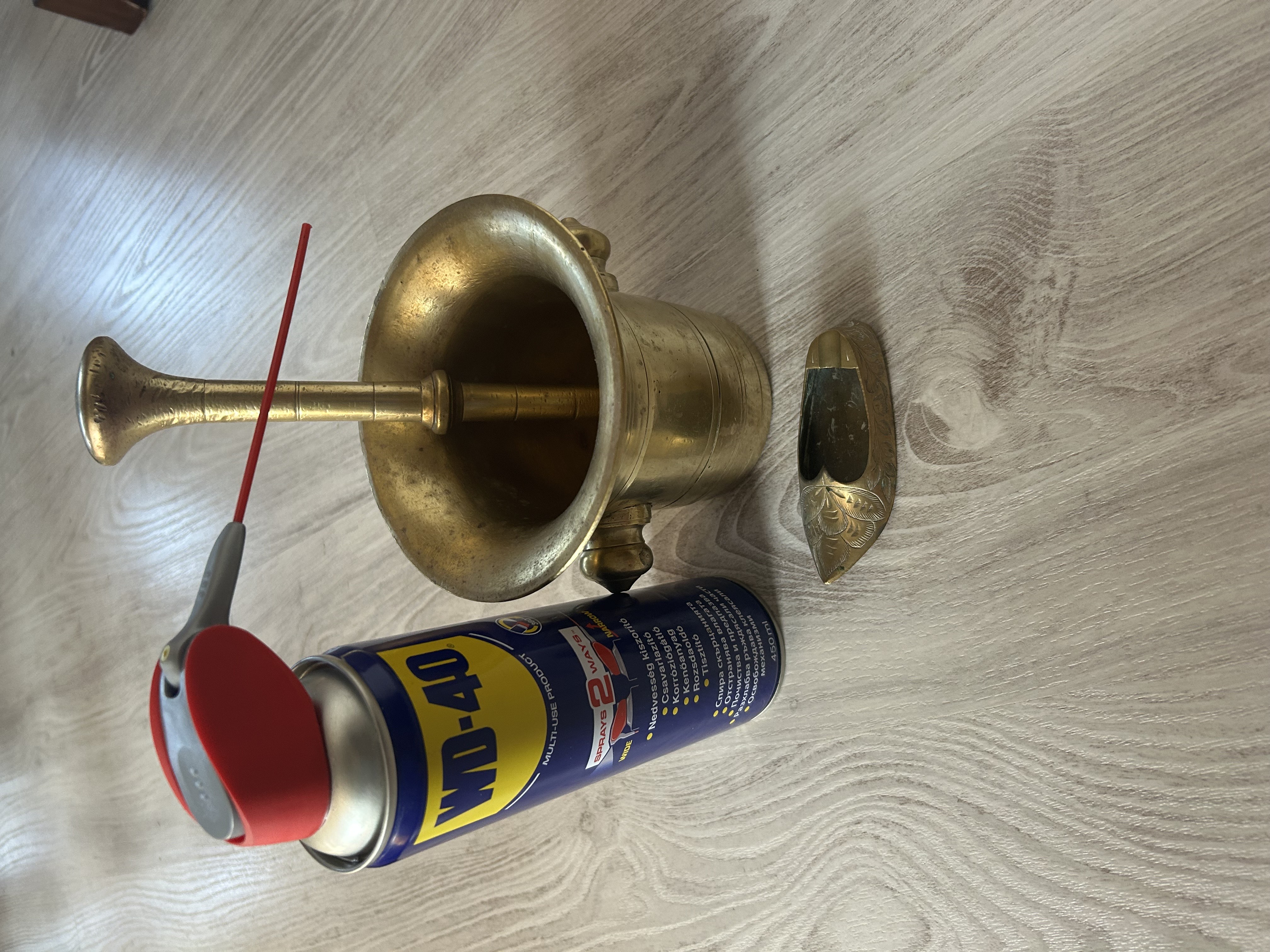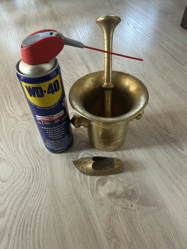 Elhanyagolt állapotban lévő réz mozsarat és réz hamutálat vásároltam és a WD 40 fajták közül ezt választottam a fényesítésre és zsírtalanításra.