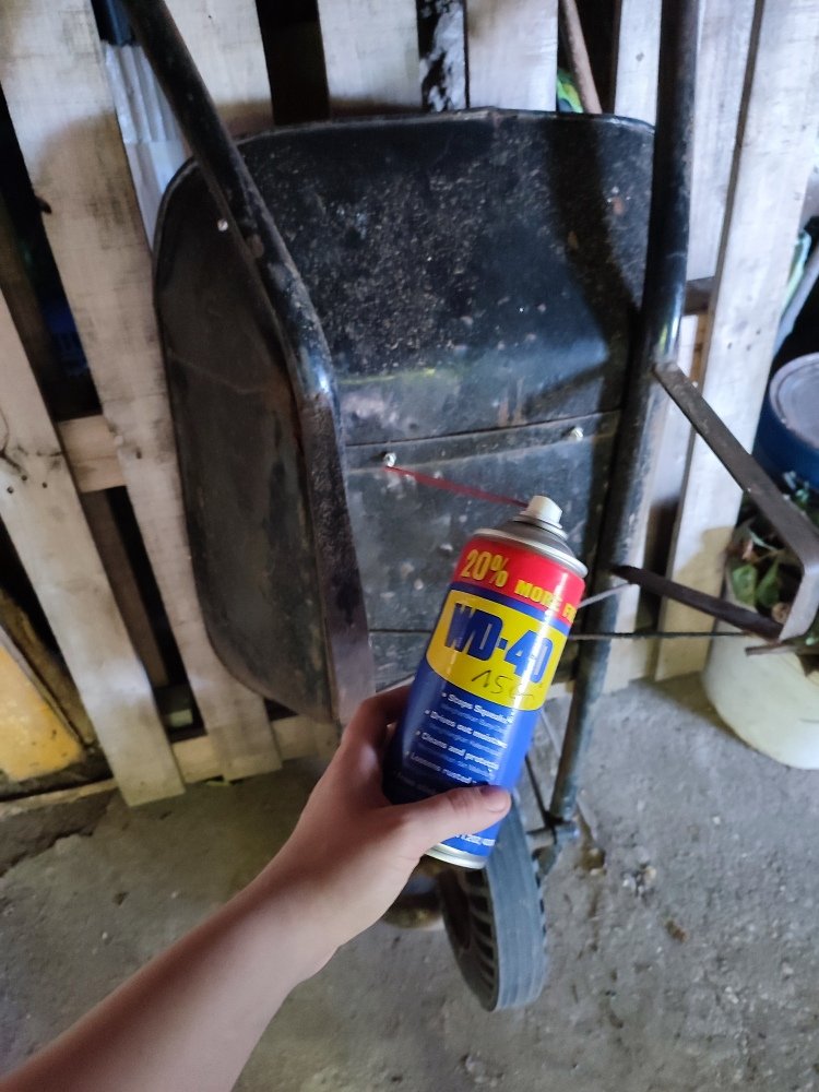 A rozsdás talicskacsavarokat hiába próbáltuk meglazítani. WD-40-nel befújva pár perc alatt engedtek, ment is tovább a munka.