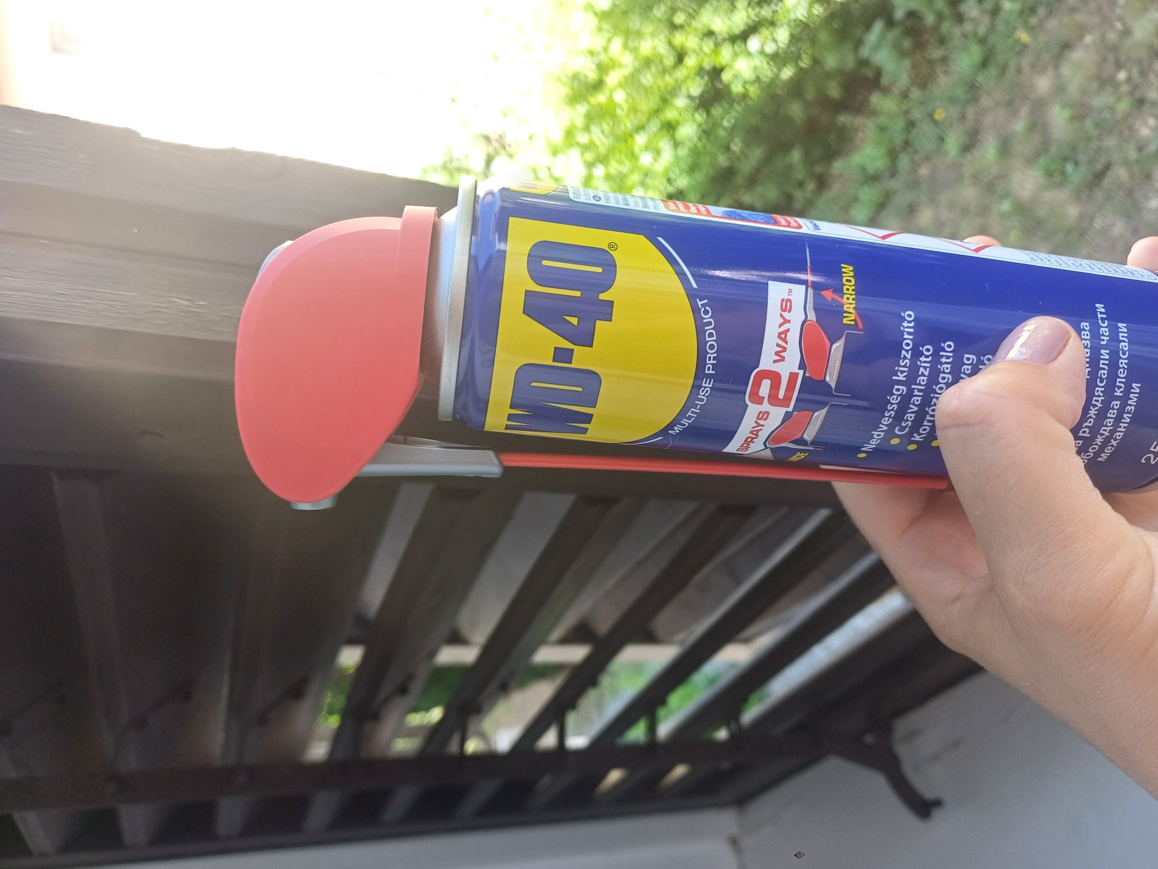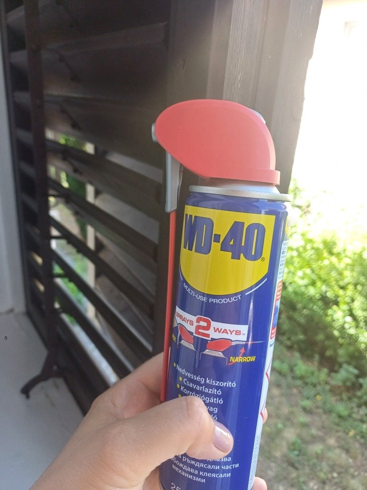 A zsalugátert WD-40-el kezelem, a nyikorgásnak egy pillanat alatt vége.